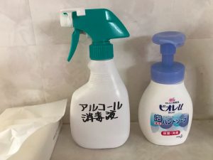 リビングにアルコール消毒液を常備し、消毒噴霧器を二箇所に常備しています。